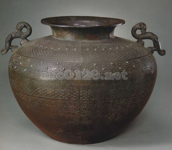 (缶+霝)は古代中国の水や酒をいれる容器で、西周時代の終り頃から春秋時代の初めにかけて盛んに用いられた。本作の器形は球形で頸部はすぼまり、口部「は大きく、肩部も広く、底は平たい。肩部両側に獣形の把手がある。器は全面が精緻で美しい蟠虺文(小さな蛇が絡み合った文様)と鱗状の文様で覆われ、肩部と胴部にはトルコ石が嵌め込まれている。出所:北京・故宮博物館名宝展-紫禁城と中国4000年の美の秘宝