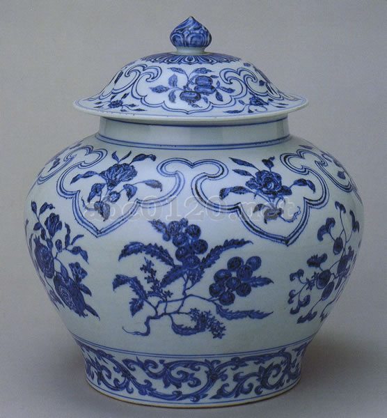 口部は直立し、頸部は短く、胴部は大きく膨らみ、高台がつく。高台内は無釉。蓋はドーム形で、宝珠形の鈕(つまみ)がついている。肩部に如意雲頭文がめぐらされ、そのなかに花をつけた折枝文が配されている。胴部には石榴、枇杷、銀杏、桜桃(さくらんぼ)の折枝文、裾には唐草文がめぐらされている。蓋の文様は、鈕に6被の花弁文、鈕のまわりに二重の菊弁文がめぐらされ、そのまわりに如意雲頭文が四つ、その内側と外側に花果折枝文がめぐらされている。この作品には宣徳期(1426~1435)の青花磁器の特色がはっきりとあらわれている。まず一つには、色調が美しく文様がはっきりしていること、顔料に含まれる鉄分が結晶化して黒い斑点があらわれていること、青花の濃淡が自在に使いわけられていて文様が極めて自然に表わされていることである。二つ目には文様の配置が非常に厳密で整然としていること、器形の特徴々生かして配置場所に応じて文様に変化をもたせていることである。文様は写意(ものの外観よりもその内実を描こうとすること)を重んじて描かれ、あるがままの生物の本質が追求されており、各部に特徴的に見られる厳密な文様配置の仕方とは鮮明な対照をなしている。出所:北京・故宮博物館名宝展-紫禁城と中国4000年の美の秘宝