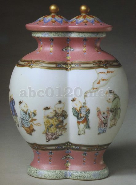 二つの瓶を連ねた形の瓶である。口縁部は直立し、頸部はすぼまり、胴部は楕円形、裾部もすぼまっている。口縁外周に唐草文をめぐらし、頸部から肩部にかけて瓔珞(珠などをつないだ首飾りの類のこと)文を飾り、胴部の上下に如意形と花文、その間に唐子や羊を配し、裾部に瓔珞文、最下部の周囲に唐草文をめぐらしている。底裏には青花で「大清乾隆年製」の篆書による銘が横書きに記されている。蓋も二つを繋いだ形とし、ドーム形で丸い鈕(つまみ)がある。この作品は乾隆年間の琺瑯彩としては珍しいものであるが、この時期には、このような形式の連瓶は他にも見られ、いずれも作りは精巧で色彩の諧調表現も美しく、清新で明快な印象を与える。胴部に描かれた3匹の羊は「三陽開泰」(陽と羊は同音。新年の開運を祝う)の意味が込められており、皇帝の吉祥如意を祝福する図案となっている。出所:北京・故宮博物館名宝展-紫禁城と中国4000年の美の秘宝