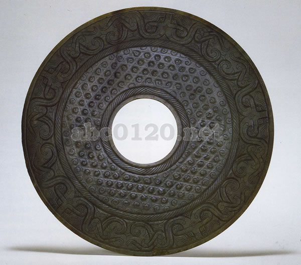 玉璧は古代中国の重要な儀礼用の玉器。最古の玉璧は新石器時代に作られ、商(紀元前16~前11世紀)、周代(西周:紀元前11~前8世紀)までは主に無地で、春秋時代(紀元前8~前5世紀)になって文様があらわれる。この種の獣面と蚕の文様のある璧はとりわけ前漢(紀元前3~後1世紀)の中後期に流行した。漢代の墓からも大量に発見されているが、やや作りは粗く、もっぱら高位の人物の副葬用に作られ、外棺の上にセットで置かれたり魔除けや防腐のために遺体の上に置かれたりした。本作の玉は深い緑色でところどころ疵や褐色の部分もある。璧は円形で平たい。表裏両面とも同じ文様で外周に五つの変形獣面文の陰刻、内周は横にねかせた蚕の文様を刻み、その間に縄目文をめぐらせる。縁は磨いた跡があり、かすかに内側にくぼんでいる。出所:北京・故宮博物院名宝展-紫禁城と中国4000年の美の秘宝