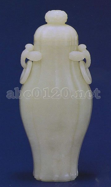 玉は青玉製で一部に白い斑があり、光沢がある。器形はやや扁平で、8区に割った瓜形に作り、短い頸部、膨らんだ胴部、菱花形の口部と脚部からなる。蓋には雲蝠と桃の文様が二つ浅い浮き彫りで表わされているが、これらには福寿の意味がある。頸部の左右に蜻蛤をかたどった把手があり、それぞれに遊環がかかっている。底裏に「乾隆年製」の篆書による陰刻銘がある。形は清新で磨きも丁寧である。この器は清代玉器において装飾品に分類される。出所:北京・故宮博物院名宝展-紫禁城と中国4000年の美の秘宝