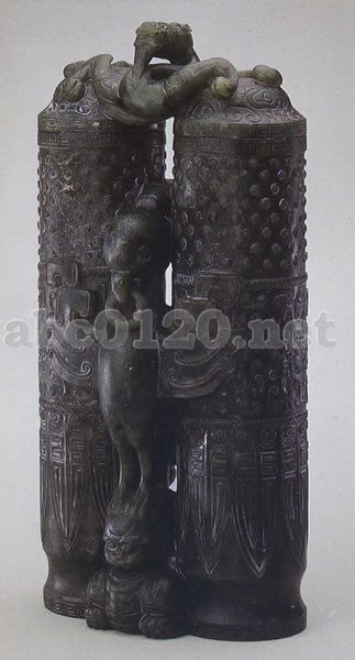 玉質は青緑色を呈し、黒い斑が入っている。器形は2本の筒が連なった形で2個所の縄目文で3段に分かれ、蓋の周囲及び口部、底の周囲には雷文がめぐっている。蓋はドーム形で雲文が陰刻され、一本の角をもつ龍が二つの蓋を繁ぐ形である。胴部正面に鷹と熊が見え、鷹は遊環をくわえ、熊を彫った部分の底に「大清乾隆仿古」の銘が隷書で縦書きされている。この作品は古代の器物を模して作られた清代玉器の一つで、各所に模倣個所がある。鷹と熊は「英雄」と同音(鷹=英、熊=雄)であり、このようにデザインに寓意性をもたせる手法は清代玉器においては比較的よく見られるものである。出所:北京・故宮博物院名宝展-紫禁城と中国4000年の美の秘宝