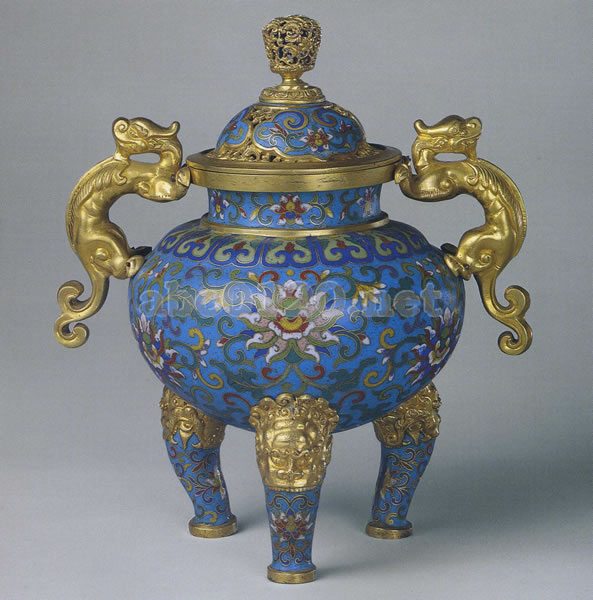 素地は銅。丸い形で蓋があり、全体に有線七宝による文様が施されている。銅部には六つの蓮花文、肩部には上下向きの芭蕉の葉の連続文がめぐらされ、脚の付根には金鍍金された獣面が飾られている。蓋には花卉文の透かし彫りが施されている。全体に藍色、淡緑色、コバルトブルー、赤、桃色、白、緑、黄色などの様々な色が用いられている。螭(角のない龍)をかたどった二つの把手、3本の高い脚、丸い蓋の上の鈕(つまみ)は銅地に金鍍金を施している。金色に輝く豪華なつくりは、皇室の風格にあふれている。出所:北京・故宮博物院名宝展-紫禁城と中国4000年の美の秘宝