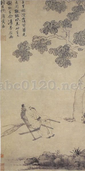 唐寅は字は伯虎、子畏といい、六如居士と号した。呉県(江蘇省蘇州)の人。弘治11年(1498)、南京の解元(官吏登用の試験「科挙」の第一次試験である「郷試」の首席合格者)となる。人物、山水、花卉画をよくし、詩文、書にもたけていた。才気にあふれ、自らの印に「江南第一風流才子」と刻むほどであった。絵画ははじめ周臣(明代中期の同郷の画家)に学び、主に南宋の院体画(南宋宮廷所属の絵画工房「画院」の画風で詩情表現を理想とする)の画法を受け継ぐとともに元代画家の筆法を吸収して創造性を加え、清らかで瀟洒な自らの画風を打ち立てた。沈周、文徴明、仇英とともに「明の四家」と称される。著書に『六如居士全集』がある。本作「桐陰清夢図」は白描画法によって老夫が一人、目を閉じ椅子に仰向けに坐り、青桐の下で涼んでいる情景を描いたもの。人物や樹石の筆法は簡潔にして力があり、衣の線はよどみなく流れ屈託がない。人物は入念に描き込まれ顔の表情にも生気があふれ、画面には豊かな情感がこもっている。画中右上は七言絶句の自賛「十里の桐陰が紫苔を覆い、先生の閑試に酔眼来れり。比の生においては己に功名の心を謝り、清夢は無に応じ、古槐に到る。」がある。落款は「唐寅画」、下に「呉趨」(朱文円印)、「唐寅私印」(白文方印)の2印を押す。出所:北京・故宮博物院名宝展-紫禁城と中国4000年の美の秘宝