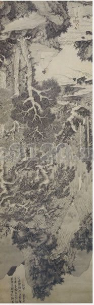 文徴明は、初名は壁、字を徴明といい、のち字で呼ばれるようになり、さらに字を徴仲とした。長州(江蘇省蘇州の人。かつて翰林待詔(文学研究を行う官職)を授かったが、のち辞して帰郷した。書画に秀で、山水、人物、花鳥画を得意とする一方、文学者としても知られる。彼は絵を元代の画家に学び、とりわけ趙孟頫や王蒙の絵に対しては「神会意解」(魂で通じ合うものがある)という。澄んだ潤いのある細やかな筆触で江南地方の山川樹木を描き、若い頃の繊細な筆法とは対照的に、壮年期には筆使いが粗放になるが、秀麗優美な画風を失うことはなかった。「呉門四大家」の一人。この図は細密描写的な筆法で険しい山峰や高い松、山中に生い茂る木々が描かれ、それらが画面全体を覆っている。麓には湖水があり、水辺には高士が一人見え、もう一人書巻を抱いて歩いて来るものがいる。松は細筆で輪郭し、山石や遠景の樹木は意のままにこまごまと描きこんでいるが、深緑のしげみなど生動感がある。画面全体を埋め尽くす構図は力にあふれ、彼の作品としては稀に見る大作である。自賛の七言絶句「碧樹蔭風を鳴らし、潤草香し。清蔭地を満たし、昼偏へに長し。長安の車馬、塵明の面誰か識る空山五月の涼を。」が画中にあり、落款は「徴明」、印は「文徴明印」(白文方印)、「衡山」(朱文方印)。画面の下左右の隅に「紗吉祥盦」、「秀水朱氏潜采堂図書」などの方印3類がある。出所:北京・故宮博物院名宝展-紫禁城と中国4000年の美の秘宝