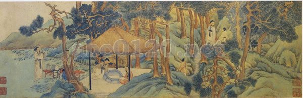 本図は清明(新暦の4月初め頃。二十四節気の一つ)の頃の文化習慣を背景に、蔡羽、湯珍、王寵(いずれも明代の学者、文化人)らが無錫(江蘇省呉県の西北の地)の恵山に遊び喫茶や詩作する様子が主に描かれている。山々に囲まれた中に東屋や竹林があり、渓流に蓮の花も見える。山道はつづら折れに下り、3~4人の文人が景色を楽しんだり、座ってくつろいだりしている。童児たちは茶会の仕度中である。全体に明るく品格のある画風や細緻な筆使いは趙孟頫の典型的な作風に倣ったもの。晩年の代表作の一つといえる。両中に落款はないが、左下に「文徴明印」(白文方印)、「悟言室印」(白文方印)の2印を押す。題跋(鑑賞の記録)があり、蔡羽、湯珍、王寵の詩及び、顧文彬(清代の文筆家、学者)の題記がある。出所:北京・故宮博物院名宝展-紫禁城と中国4000年の美の秘宝