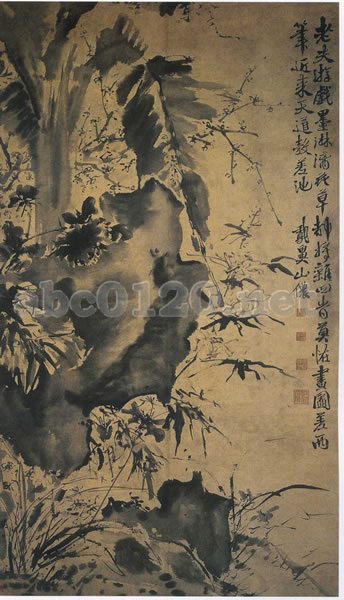 徐渭は、字は文長、号は天地面天、青藤居士など。浙江省山陰(紹興)の人。詩文、書をよくし、草花、竹石画に秀でる。また著名な文学者、戯曲作家でもある。彼の手になる戯曲『四声猿』などはかつて湯顯祖(万暦く1573~1620〉頃の戯曲の著名な研究家、作家)などの大家の好評を博している。自らは「吾は書を第一とし、詩が第二、文が第三、画は第四」とするが、その書、画、詩文はいずれをとっても優れている。生涯を不遇のうちに過ごしたが、その陰鬱感は作品の上にも常に反映している。彼の写意(ものの形ではなく精神性を描こうとする)花卉画は、筆使いは奔放自在、水墨はあふれるばかりに力強く、後の花卉竹石画に深い影響を及ぼした。「四季花卉図」は、大いに写意的な筆法を用いて蘭、水仙、芭蕉、梅花、竹など四季の草花を奔放な筆使いで力強く存分に描いている。時間と空間の制限を越えて、異なる季節の花々を同一画面に収める手法は、中国画の優れた表現力を示すものといえる。画中の自題は「老夫游戯すれば墨は淋漓、草花は都な将に四時を雑う。怪しむ莫かれ図画、両筆差うを。近来の天道は差池(高低上下するさま)を教う。」落款は「鵝鼻山儂」、下に「天池山人」、「青藤道士」などの印を押す。徐渭の写意花卉画の中の代表作である。出所:北京・故宮博物院名宝展-紫禁城と中国4000年の美の秘宝