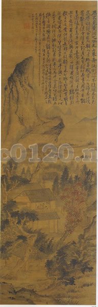 原済は本姓は朱、字は若極、小学(幼少の呼び名)は阿長。明朝の王族で靖江(江蘇省の県)の王であった朱守謙の11代目の子孫。明朝の滅亡後、剃髪して僧となり、法名を原済、字を石濤、また苦瓜和尚、大滌子、清湘老人、瞎尊者などと号した。靖江王の邸宅が広西の桂林にあったことから広西の人とされる。才能に恵まれ、山水、人物、花卉画をよくし、筆致は奔放で力強い。伝統にとらわれない革新的な創造性によって後世に大きな影響を及ぼした。この図は唐代の詩人李白が詠んだ「将進酒」の詩意にもとづき、康熙38年(1699)、作者58歳の時に描かれたもの。画中には峰がそびえ立ち、樹林がうっそうと繁る。斜面の林の陰には柴垣で囲まれた東屋があり、その中で3人の文人が酒を飲み、詩を詠んでいる。そこに坐しているのが「詩仙」の異称をもつ李白その人で、かたわらには友である岑勲、元丹邱がおり、二人の童児が酌をしている。筆致は力強く、落ち着きがある。岩には淡墨で皴(山水画で岩のひだなどを表わすための筆法)が表わされている。宋代の范寛(宋代初期の山水画家)の画体を用い荊浩(唐末~五代)の筆意に学んだと自称している。出所:北京・故宮博物院名宝展-紫禁城と中国4000年の美の秘宝