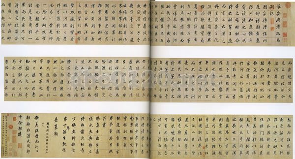 董其昌は字は玄宰、号は思白、また香光居士。華亭(上海市松江)の人。万暦17年(1589)進士(官吏登用試験である「科挙」の合格者のこと)となり、南京礼部尚書(礼部省という儀礼などを司る役所の長官)の官位まで登るが、政変にあい官を辞して帰郷した。没後、文敏と諡される。董其昌は天才俊逸と讃えられ、早くから詩文、書画をよくし名声をはせた。その書風はのちの清代中期まで影響を及ぼし、康熙帝、乾隆帝ともに彼の書を手本とした。本作「濬路馬湖記」は行書体で一枠に一字ずつを配するが、書風は李北海(唐代の書家。行書に優れる)に近く、運筆は練達にして重厚、側筆の用い方も厳格である。行書中の優品であるばかりでなく中国書道史中、後期の行書を代表する作品である。巻末に清代の書家沈筌の題跋(鑑賞の記録)のほか、乾隆、嘉慶、宣統内府、安岐、王鴻緒、張若靄など27類の鑑蔵印がある。『墨縁彙観』『石渠宝笈』初編に収録されている。出所:北京・故宮博物院名宝展-紫禁城と中国4000年の美の秘宝