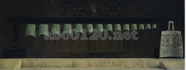 戦国時代に音律知識は大いに発展した。編鐘,編磬はセットの打楽器である。この編鐘は紐鐘(釣下げ鐘)で紐(釣り手)は縦長の梯形をなし,象(文様帝)は二層で渦状文を描く。篆の両側に乳状の枚(突起)が三つずつあり, 鼓面に変形蟠螭文を施す。この編鐘は全部で14個あり,大きさの順に一列に並べられたが,木製の台は出土時,跡形もなく腐っていた。この編鐘ほ数の上で湖北省随県出土の編鐘には及ばないが,河南省信陽長台関出土の「(刑+田)(竹+鬲)」編鐘より1個多く,四川省涪陵出土の編鐘と同数である。中山国王墓からの編鐘の発見は中山国の音楽の成果を示すとともに,中山国が周王朝の礼楽制度を採用していたことを物語る。出所:「中山王国文物展」-中国戦国時代の雄