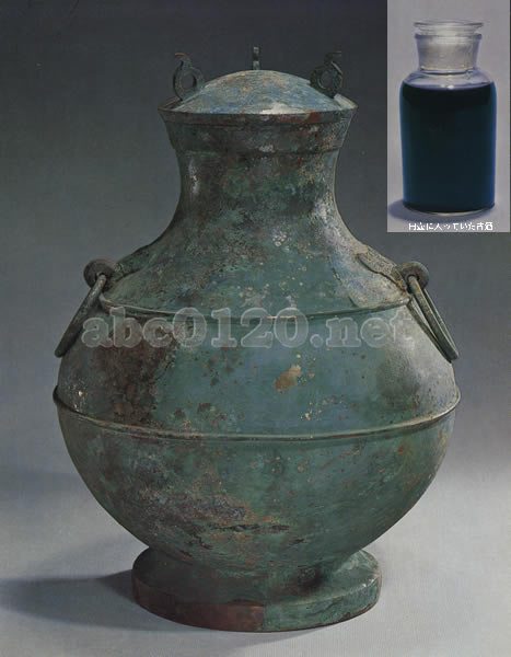 盛酒器。圏台,平底,円鼓腹,なで肩,頸はしまり反り口。肩部と腹部中程に一筋ずつ凸弦文を持ち,両肩に鋪首(環をくわえる獣面)を持つ。九みのある蓋は落し蓋で,蓋に等間隔に雲形鈕三つ。出土時,壺内には墨緑色の酒があり,蓋を開けると酒の香りが鼻を突いた。