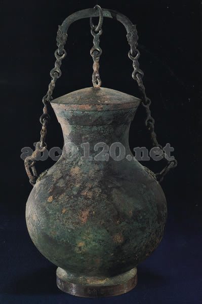 盛酒器。圏台,平底,円鼓腹,なで肩,頸はしまり,反り口,円鼓蓋。蓋中央に環状の摘みがあり,鎖二節が付く。両肩の鋪首のくわえる環には鎖が各五節付き,その間を璜形をした龍首の把手でつないである。蓋上の二節の鎖は大きな環で把手の鎖につながる。出所:「中山王国文物展」-中国戦国時代の雄