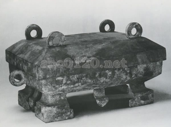 青銅 通高18.9口長28.7口幅19.5 重1lkg 1977年中山王(興+昔)墓出土 食器。四点出土。穀類を盛る器。蓋は梯形台状で,四隅に環形の鈕が付き,各面は平板である。器壁は垂直で平底である。器表両端に環形の耳を持ち,下端四隅には曲尺形の足がある。足の間にはそれぞれ舌状の飾りがある。出所:「中山王国文物展」-中国戦国時代の雄