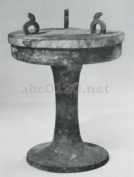 青銅 通高24.2 口径18.9 重2.4kg 1977年中山王(興+昔)墓出土 食器。一対出土。ラッパ形台座,細長の支柱,平底,器壁は垂直な浅盤。蓋の上は平らで縁は直角に下に折れている。上には等間隔の雲形鈕三つ。出所:「中山王国文物展」-中国戦国時代の雄