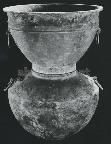 煮炊器。釜と甑から成る。釜は下部に三本の支釘を持ち,平底で下腹部は僅かにふくらみを持ちながらすぼんでいる。肩はゆるやかに折れ,口縁部は垂直である。両肩に鋪首を持つ。甑下部は圏台付の平底で,釜の受け口にはめ込める。腹部はふくらみを持ちながらすぼんでおり,垂直な口の縁は折れている。上部に一筋の凸弦文があり,両側に鋪首を持つ。底部は細長の孔の開いた「箄」(すのこ)である。出所:「中山王国文物展」-中国戦国時代の雄
