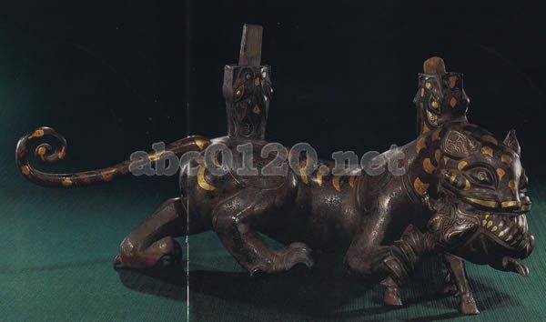 障蔽用具。斑文鮮やかな猛虎はぴんと延ばした尾の先を巻き,強靭な体を弓なりに曲げ,鋭い爪で小鹿を掴む。小鹿は虎の大きい口の中でいたずらにもがき,僅かに開いた口もとから悲鳴を上げているようだ。強弱をことさらに対比した格闘シーンがいきいきと現出する。虎の盛り上がる筋骨,獰猛,敏捷でたくましい肢体に対し,小鹿の弱々しくほっそりとした姿,そして双方の体に象嵌された斑文,どれもが手がこんで真に追っている。虎の前足は鹿を掴んで宙に浮いているため,器体のパランスは鹿の足で保たれており,趣向が凝らされていて, しかも自然である。戦国時代の芸術品の中でも傑作に数え上げられよう。