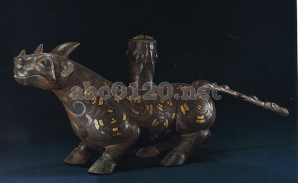 障蔽用具。犀は立って,尾をぴんと延ばす。頭部には鼻,額,頭頂と一線に角が並び,全身を金銀の象嵌文様が覆う。背に獣面のある長方形の銎を負う。銎にはまだ木の枘が残っていた。これは「虎」や「牛」と共に出土した。セットで曲尺形屏風の下部台座となる。出所:「中山王国文物展」-中国戦国時代の雄
