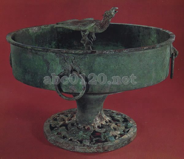 下部円形台座には蟠文が透かし彫りされている。座中央に立つ細腰形の円柱が大盆を支える。盆は口縁が外側に折れ,器壁は垂直だが腹部で内に曲がるので,平底は狭い。外壁には等間隔に四羽の飛鷹が付き,振り向いた首に環をつるす趣向が面白い。盆内底部にいる一匹の鼈が円柱を背負う。柱上には2匹の蛇をつかんでいる雄鷹が留まる。今にも飛び立たんとする鷹の姿は,生動感にあふれた所新な造型で,凝った意匠である。出所:「中山王国文物展」-中国戦国時代の雄