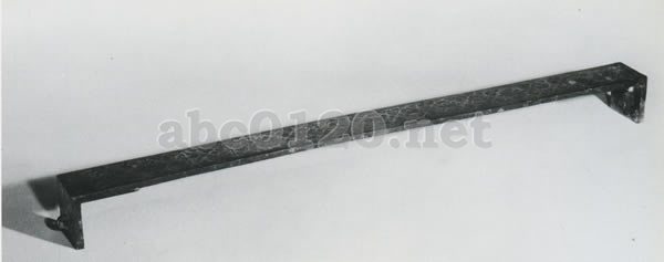 長条形。両端は直角に下に折れ曲がり,先端には半環形の鈕がある。銀の雲文が象嵌してある。漆器にはめ込んだ付属品であろう。出所:「中山王国文物展」-中国戦国時代の雄