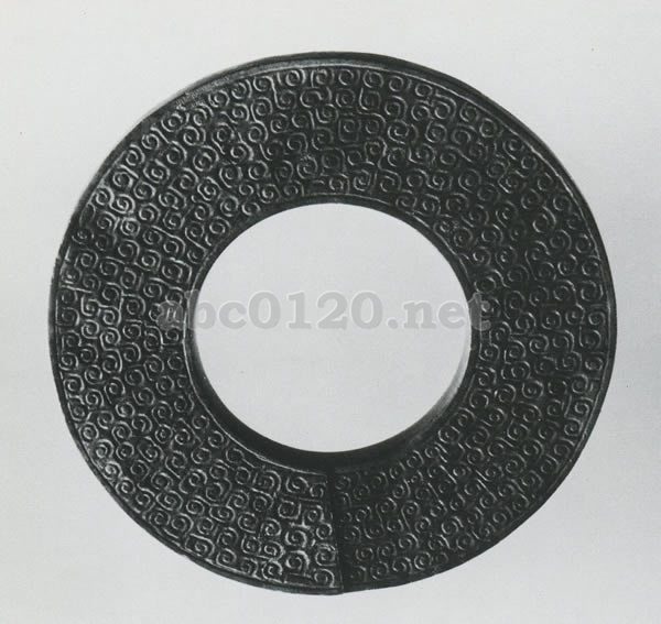 玉 径14.2重255g 1977年中山王(興+昔)墓出土 黄玉。内側を雲文で飾る。瑗とは大きい孔の璧をいう。貴族の装身具。出所:「中山王国文物展」-中国戦国時代の雄