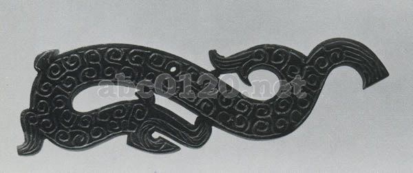 黄玉。身をくねらせる夔龍の形をし,雲文で飾られる。背に綬にかける努孔がある。貴族が腰に下げた装身具。出所:「中山王国文物展」-中国戦国時代の雄