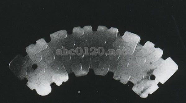玉 長5.4 幅1.6 重6g 1977年中山王(興+昔)墓出土 白玉。孤形。雲文で飾られる。両端に綬にかける孔がある。出所:「中山王国文物展」-中国戦国時代の雄