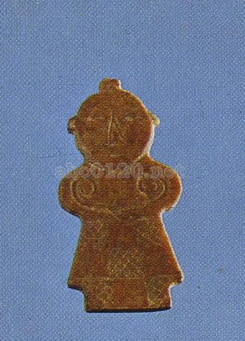 玉 長2.5 幅1.2 重1g 1974年中山王陪葬墓出土 黄色の玉片製。一つのまげを結い,筒袖の長衣をつけ,袖に両手を入れて立つ姿。当時の少数民族の童子像。出所:「中山王国文物展」-中国戦国時代の雄