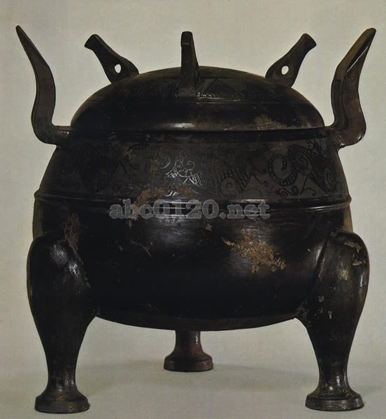 鼎下部の三足は蹄形。平底,鼓腹,耳が付き,口縁は内側にすぼまり,丸みを帯びた蓋がつく。蓋の斜面に等間隔に三つの長形のつまみがある。蓋の頂上と縁,その中間の三ケ所が磨き出してある。頂と中部の磨いた箇所の間には相対した巻雲文があり, すき間は細い波折文でうずめてある。中部と周辺の間には鋸歯文がありその空間はやはり細い波折文でうずめている。鼎の腹部は一本の凸弦文で区切られ,上部には獣文の間に巻雲文と小さい波折文が圧されている。合計五点出土。出所:「中山王国文物展」-中国戦国時代の雄
