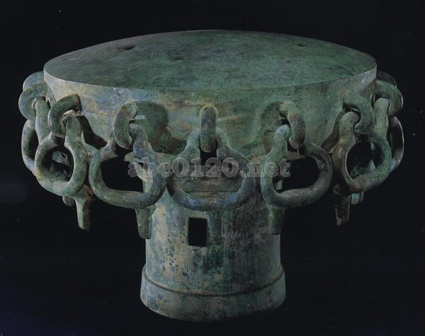 きのこ形,上端に丸みがある。上端は等間隔に三角形の孔が開き,周壁は垂直で半環形の留め金が15付く。留め金にはそれぞれ鴨頭状の環が掛けられている。下部は円筒状の差込口になり,大い円柱に差し込むことができる。円柱の高さは5メートル前後と推定される。留め金に15本のロープを結び,放射状に張って周囲に固定すれば,上に毛布か皮革をかぶせて円形天幕ができる。出所:「中山王国文物展」-中国戦国時代の雄
