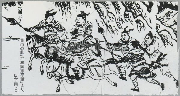 宦官天下の中央政局の腐敗と混乱は、社会不安を激化させた。ここに忽然と出現したのが、道教系の新興宗教「太平道」の教祖張角である。張角とその弟子は布教のさい、お札と霊水によって病気を癒す術を用いた。これが不安心理にとりつかれた人々にアピールし、あっというまに多くの熱狂的信者が生まれた。野心家の張角は、ここで勝負に出た。中平元年(一八四)、数十万によくれあがった信者を三十六の方(軍管区)に編成、これを卒いて後漢王朝打倒をめざし、 一気に峰起したのである。 このこと張角の信者たちはみな、頭に張角のシンボルカラーである責色いターバン(黄巾)を巻いていた。黄色いターバンをなびかせながら、みるみるうちに町や村を占領してゆく黄巾軍の破竹の進撃は、後漢王朝を震憾させた。正規軍だけでは、とても黄巾軍の大攻勢に対抗することはできない。進退きわまった後漢王朝では、中国各地に檄を飛ばして義勇軍をつのることになった。出所:「三国志を行く 諸葛孔明編」