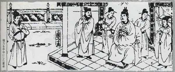 中平六年(一八九)、宦官のいいなりであった暗愚な霊帝が死去、幼い少帝が即位し、少帝の母何后の兄である何進が権力を掌握すると、またぞろ後漢王朝の宿痾である外戚と宦官の権力闘争がむしかえされた。何進は、当時隷校尉(警視総監)だった袁紹(?~二〇ニ)と手を結び、宦官派を一掃しようとはかった。しかし、宦官派と結び付きの強い何后に制止され、焦った何進は表紹らの反対を押し切って、山西省一帯に勢力を張る軍閥の獰猛なリーダー董卓(?~一九二)を呼び寄せ、宦官派と何后を威嚇しようとした。これが結局、災いのもとになった。