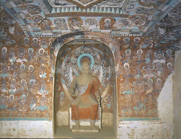 仏倚坐像を本尊とする窟内は統一的な構想に基づいて造営され、特に堂内荘厳に絵画が果たす役割は大きく、さまざまなモチーフが窟内を飾っている。例えば天井は、ラテルネンデッケの藻井を天宮伎楽図や飛天図が囲、また南北側壁は千仏図でびっしり埋め、中に方形の区画を設け、そこに仏説法図を描いており、これらの壁画配置形式はその後長らく受け継がれていく。