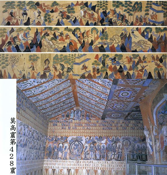 第四二八窟は北周時代の代表窟で、大規模な中心方柱式窟の南・西・北側壁の中心帯にほぼ方形の画面を横に連続させ、そこに仏誕・降魔成道・涅槃などの仏伝図、仏説法図の諸場面を描き出している。