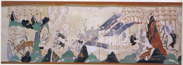 本図は、西端を起点として以下の八宗から成っている。官殿で盗賊の動勢を聞き、出兵を下知する国王(①)、騎馬の隊長を挟んで前に二騎、後ろに四騎の官軍が隊陣を整えて討伐に向かう(②)、徒歩の盗賊五人と五騎の官軍兵士が弓、槍、刀などで激しく交・戦する(③)、捕らえられて騎馬の二兵士に拘引される盗賊と再び隊列を整えた官軍(④)、建物の前で処刑される強盗たち(⑤)、竹林で苦しみもがく盗賊たち(⑥)、眼を得て仏を拝する(⑦)、山林中で禅定す打る盗賊たち(①)。西魂第二八五窟の五百強盗成仏因縁図は、同内容の優れた先行作例であるが、ここで注目される両者の人きな相違点の一つは、第二八五窟壁画が、宮賊交戦のシーンから始めて盗賊たちの処刑、そして得眼帰仏に至る過程を、仏をニ度にわたって登場させ、清爽感豊かに描き出すのに対して、本図では、終始整然と秩序だった官軍の圧倒的描写が、むしろ画因となっているかのような、仏教説話画の持つ聖俗の位相の逆転が強く感じられる点である。当時の社会状況、とりわけ農民峰起の頻発と為政者たちの政治のありようがここに反映されているとすれば、まことに興味は尽きない。出所:『砂漠の美術館-永遠なる敦煌』中国敦煌研究院設立50周年記念