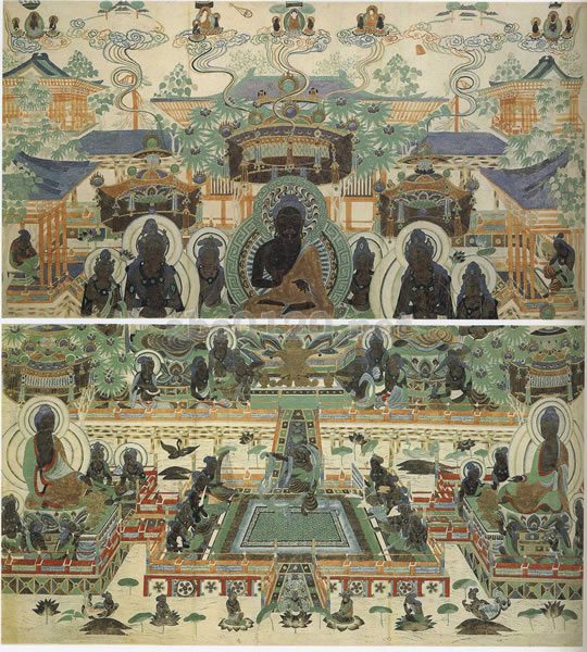本図は、第三二〇窟主室北壁観経変相図の左右両縁の序文義および十六観部分を省いた中台、すなわち阿妬陀極楽浄土図の全景である。本窟造営は、盛唐時代後期開元年間も末頃の造営とみられ、阿弥陀浄土図相も進展整備が著しく、今日我々が当麻曼茶羅中台に見るものに近づいており親しみ深い。比較的小窟のため両面も狭く、広壮な浄土空間を現出するには至らないが、中央に阿弥陀三尊以下諸尊の集う華座段、それを取り囲む宝楼段を描き、画面をほぼ三分するようにその前方を蓮池としてそこに宝壇を設け左右に相対して樹下会を、中央には舞楽会を配する。蓮池では奏楽・舞踊の菩薩、あるいは迦陵頻伽、孔雀、鴛鴦などが、この極楽阿弥陀浄土の蓮池に化生した童子たちを歓び迎える光景が展開している。なお羊座段左右にそれぞれ描かれる一楼閣内の思惟形菩薩は、当麻曼陀羅にはないモチーフで、本図にやや後れるが大規模な浄土景観を描き出した第一七二窟の北壁観経変相図にもみられ、幸いに阿弥陀浄土に生まれ得た者が、さらに成仏するべく阿弥陀の説法を聴いて修行するところを表すものであろう。