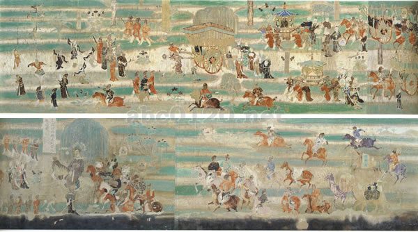 第一五六窟の北腰壁から東壁腰壁にかけては、宋国河内郡夫人に封ぜられた張議潮夫人の出行図が張議潮のそれと相対して描かれ、こちらは現世の富貴を象徴するかのように賛を凝らした夫人や娘の輦、六角亭式の擔輿、馬車の行列が続く。行列の後方近ぐに張議潮と同様、白馬に乗った宋国夫人がひときわ大きく捕かれ、″宋国河内郡夫人宋氏出行図″の傍題が記されている。