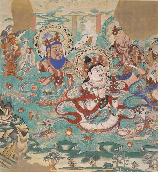 「龍王礼仏」は五代に出現した新しいテーマで、中では、莫高窟第三六窟のものが保存状態もよく代表作とされている。この窟は、もともと第三五窟の前室であり、西壁の中央に第三五窟の甬道口が開かれ、その南北に八大龍王およびその眷属が、二手に分かれ門口方向へと馳せ参ずる様子が描かれている。本図はその南側壁画で、先頭の龍王一体の大部分を欠くが、他の三龍王、三龍女等が広闊な海上を浮遊してまさに眼前に迫り来る様を表わす。敦煌出土文書P・三五六四『莫高窟功徳記』には「出門両頬に八大龍王を絵く、……其れ画は乃ち龍王海に在り」とあり、内容的に本壁画と一致することから、同記が記すように本壁画は左馬歩都虞侯・梁幸徳父子等の発願によるもので、制作期は同じくいくつかの敦煌出土文書の考察により清泰年間(九三四ー九三六)とされている。龍王は人面人身龍尾で、天部などと共通する武人的風貌の中にも敬虔な表情をたたえ、大袖の裾襦を翻し、付き従う龍女などと共に的確な描線によって力強く、あるいは瀟洒に描き出され、生動感に富む。墨の渦巻きや波文様に白緑を重ねた海面に怪魚が頭をもたげ、火焔宝珠が飛び、海辺の景も奇趣に富んで、幻想的な画面を一層にぎやかなものにしている。