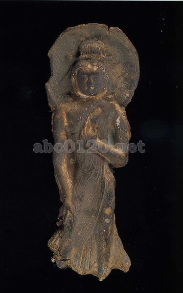 この像も藁苆入りの荒上、麻苆入りの中土、細かい仕上土からなり、その造り方としては、雌型に沿ってまず中土を入れ、次に荒土を詰めて型から抜き、表面に薄く仕上土をかけ、さらに衣文線などを陰刻したものであろう。やや前傾する光背の裏面は項荒土の上に弁柄彩があり、体部以下の裏面は接着剤の上に藁苆入りの壁体表層が附若している。表面は弁柄塗りの上に白土地の彩色が施されている。いま剥落が多いが、絡腋に朱、右腋下と裙に群青、蓮蕾に緑青が残る。頭光の輪廓に沿って一線が刻されている。出所:『砂漠の美術館-永遠なる敦煌』中国敦煌研究院設立50周年記念