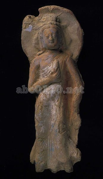 塑造彩色 高39.0 北魏 菩薩立像(2)とほぼ左右対称の形の影塑で、造り方も全く同じである。作風も極めてよく似ており、同じ窟にあったものであろう。彩色は剥落が甚だしく、わずかに裙に緑青が認められる。出所:『砂漠の美術館-永遠なる敦煌』中国敦煌研究院設立50周年記念