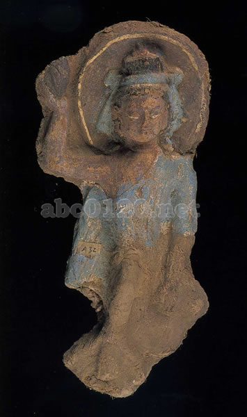 供養菩薩像(1)と同様に北魏窟の方柱に貼付されていた影塑である。右膝を立てて坐り、左手は垂下して左膝上に伏せ、右手は肘を側方に張って上げ、蓮蕾を捧げる。これと同じ姿の影塑がいま第二五七窟の方柱に残っている。肉身部に淡紅色(丹と滑石の混合)、絡腋には群青が残り、頭光は朱彩で、白緑で縁取っている。出所:『砂漠の美術館-永遠なる敦煌』中国敦煌研究院設立50周年記念