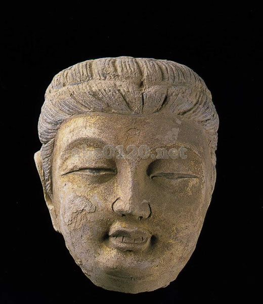 口を開き上歯をあらわす丸彫り風の菩薩頭部。髻が欠失している。頬のしまった顔立ちで、盛唐前期(八世紀前半)の作であろう。左目と左小鼻が右側より下っており、顔を右に傾けていたかと思われる。口を開いた菩薩像は壁画にはしばしば見え、塑像遺品は珍しいが、ギメ美術館にあるペリオ請来品に一例を見る。表面は白土地に金箔を押して仕上げているが、この仕上げ方は初唐の第三二二窟本尊の肉身部を始め、千相塔にあった盛唐期の比丘頭部など数例に確認される。髪は墨塗り、黒目に墨、唇に朱が残り、髪際の金箔の下に朱線が見える。