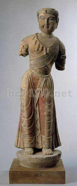 表面は肉身部に肌色が残り、裙は弁柄地に薄い橙色地の縦縞を入れ、その裾も橙色地である。橙色地の部分には単純な形の花文を描き、その弁柄の輪廓線が残るが花文の中の彩色は剥落している。なお台座は蓮華座の上半が残るだけであるが、その側面には仰蓮を描いていたのであろう。出所:『砂漠の美術館-永遠なる敦煌』中国敦煌研究院設立50周年記念