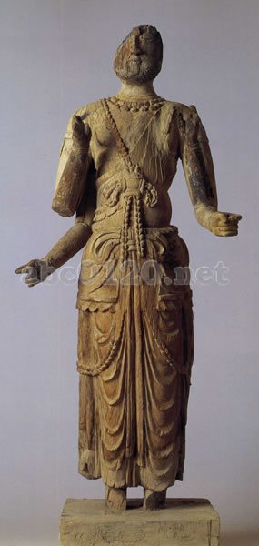 敦煌には数は少ないが木彫仏像の遺品も見出されている。窟前にしつらえられた木造の殿堂などにまつられることがあったのであろう。本像もその一つで、他にペリオが入手した十数体の木彫像がいまギメ美術館にある。