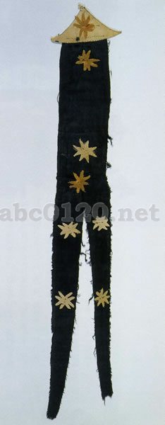 これは保存状態も良好な小型の幡である。 一九六五年十月、第一三〇窟南壁初層壁画下の孔から発見された。三角形の幡首は二層の白い絹を用いて縫製してあり、幡身と幡尾は薄く乗らかな深い青色の絹を用いている。幡首から幡尾までに、黄色、緋色を絞り染めにした絹と白色の絹をそれぞれ八弁の花形に切り取ったものを八枚、綴り縫いしてある。