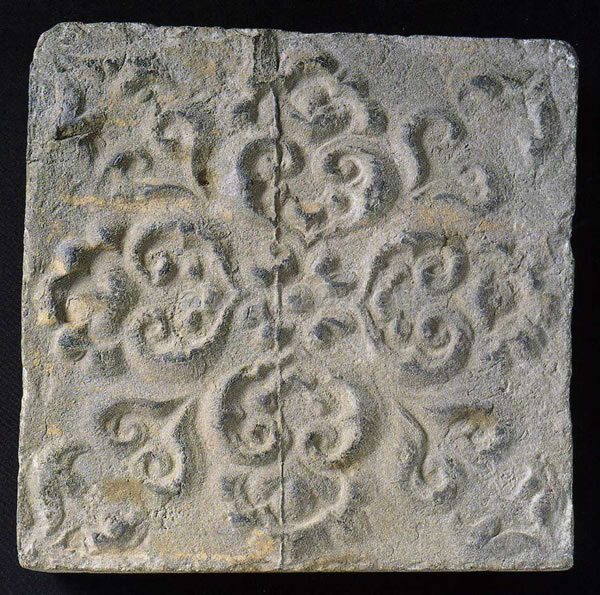 一九六三~六五年に、莫高窟の窟前遺址を発掘中に出土した磚で、灰色を呈している。四弁の小花を中心に置いて花心とし、外側に弧を連ねた雲頭蓮弁文の花弁四枚を配し、この花心と雲頭蓮弁文花弁の間に別に桃形の雲頭花弁を一つずつ、計四つ配する。この二種類の花弁が組合わさり、ひとつの蔕(ヘた)状の文様を構成している。四角形の四隅にはそれぞれ内巻の雲頭文と花弁文が一つずつ配されてある。この磚は装飾的効果に富み、文様構図の粗密も適切である。宝相華文様は、敦煌唐代の壁画やその他の地区では多種類の器物の表面に表されて流行した。例えば、敦煌莫高窟第四九窟、第四一窟、第二三窟など、宝相華を文様とした花磚は、莫高窟でも比較的多くの窟内で敷設されたのであった。出所:『砂漠の美術館-永遠なる敦煌』中国敦煌研究院設立50周年記念