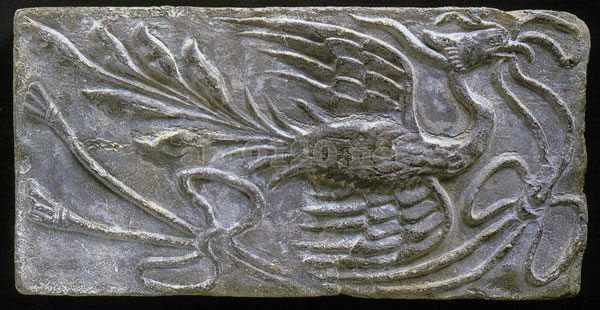 ″鳳″については、後漢の許慎の『説文』に、「鳳は神鳥である。天老が言うには、鳳のかたちは、前は麒麟、後ろは鹿、蛇の頸(くび)に魚の尾、龍のうろこ、亀の背、燕の顎に鶏(にわとり)のくちばしをもつ。羽毛は五色である。東方の君子の国に現れ、四海の果てまで天翔(あまか)けるときは、西は崑崙の頂きをよぎり、中央は砥柱(しちゅう、黄河の中流)の水を飲み、東方の弱水に羽根を洗い、北は風穴に宿る。見ること則ち天下の大安寧である。」とある。鳳は百羽の鳥を集めてようやくその一羽分の大きさとなる。その姿は瑞祥を象徴し、徳、義、礼、仁、信の美徳が寓せられ、声良く舞う姿良く、天下に吉祥と平安をもたらすとされて、この美しい寓意の神鳥は、古代以来人々に好まれてきた。鳳の形象は塔廟、仏堂、王宮、墓室など、いたるところに表され、その造形は時代の美的感覚に拠りながら多彩な変化を遂げたのであった。出所:『砂漠の美術館-永遠なる敦煌』中国敦煌研究院設立50周年記念