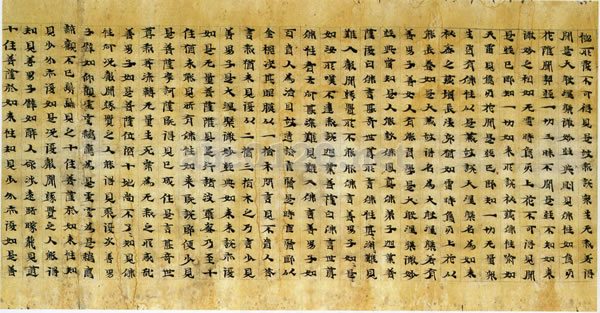 首尾をともに欠く。はじめの行は「(欠)我與無我性相(欠)」とであり、終わりの行は「念、此中動者為是虫耶、為塵土耶、久視不己。」である。写本には紀年がない。書法からみて、縦・横・右はねはいずれもS797号の建初元年(四〇五)『十誦比丘戒本』写本に類似する点が多く、異体字にも差異がない。書写は一糸乱れず、建初元年の『十誦比丘戒本』に比べ、規範にかない、成熟度も高い。どの字も美しく、かなりの名手とみられる。『大般涅槃経』は比較的よくみられるが、書法において、これほど精美なものはロンドンに蔵する敦煌写本の中にも多くない。出所:『砂漠の美術館-永遠なる敦煌』中国敦煌研究院設立50周年記念