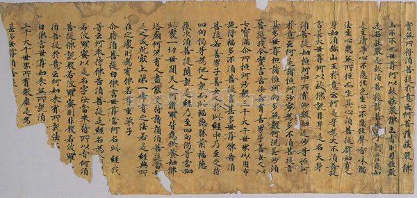 首尾ともに欠く。全部で二八行である。 一行は十六から十八字と不統一である。「実無所得、須菩提于意云何」に始まり、「甚多世尊、須菩提」で終わる。かつて水に浸かったことがあるらしく、紙は退色している。罫線はととのい、紙の質は比較的厚い。書法は流麗な楷書である。『金剛般若波羅蜜経』は敦煌文書中、数量の多い写経の一つである。出所:『砂漠の美術館-永遠なる敦煌』中国敦煌研究院設立50周年記念