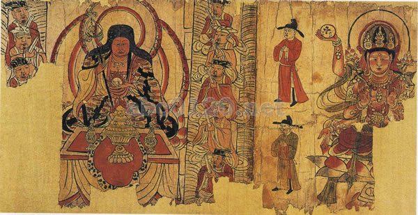 十二経の巻頭見返し絵の断片である。この見返し絵には、地蔵菩薩図と観音菩薩図が、別々の区画に描かれている。観音は六腎で、うち上方の二手に日輪(欠失)と月輸を掲げている。地蔵は観音よりも重要視されたものとみられ、その両側に、五人ずつ縦に並ぶ十王を伴い、右側の五王の後方には二人の供養者が立っている。尚、大英博物館にはこの左に続く断片があるが、そこには左側の五王の後方にもまた、短冊形を伴う一供養者の上半身が残っている。そしてその供養者の後には十二経が続けて記されている。十世紀末の仏教徒達は、地蔵菩薩と観音菩薩とを、同じく来世への案内者と考え、同等の信仰心を抱いていたのである。敦煌では、観音と地蔵が非常に密接な関連をもっていたことが、本図のほか、ペリオ・コレクションにおけるいくつかの作例からも明らかである。出所:『砂漠の美術館-永遠なる敦煌』中国敦煌研究院設立50周年記念