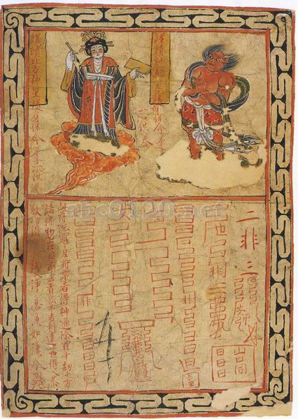 上段には二体の神像、下段には護符の形式を踏まえた記号のようなものと漢字の文章とが表わされている。これらは、寄進者の護身保命を上段の二神に求める目的で制作されたものである。右側の像は計都星(けつせい)で、緑色の雲上に立っていたが、その雲は現在ほとんど剥落してしまっている。左側の婦人像は北方神星(北辰)である。下段の銘文には、以下のようなことが記されている。この護符を携えるものは誰でも、神通力を得、永劫の罪から許される。そして十方諸仏がことごとく眼前に現れ、去者(旅する者?)はどこへ行っても幸運と利達とに恵まれる。護符の威力は、漢文の文章の右側にみられる記号のような書体にこめられている。その表現は、近年まで道教の護符に用いられてきた形式と類似しており、宮印の書体を彷彿とさせる綿密な仕上げがなされている。護符全体の解読はなされてないが、大体漢文で記されている内容に等しいと考えられる。出所:『砂漠の美術館-永遠なる敦煌』中国敦煌研究院設立50周年記念